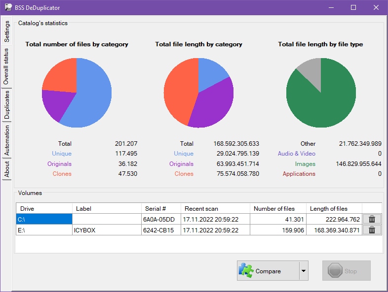 The red part of the pie represents clones, which may waste space of your drive and can be removed.Usually you don't want to see duplicate files on the offline media such CDs or USB if they are not participated in the last scan - this is the default behaviour. If you like to see all the duplicate files found on all media you can choose Compare all in the split button on this register tab.